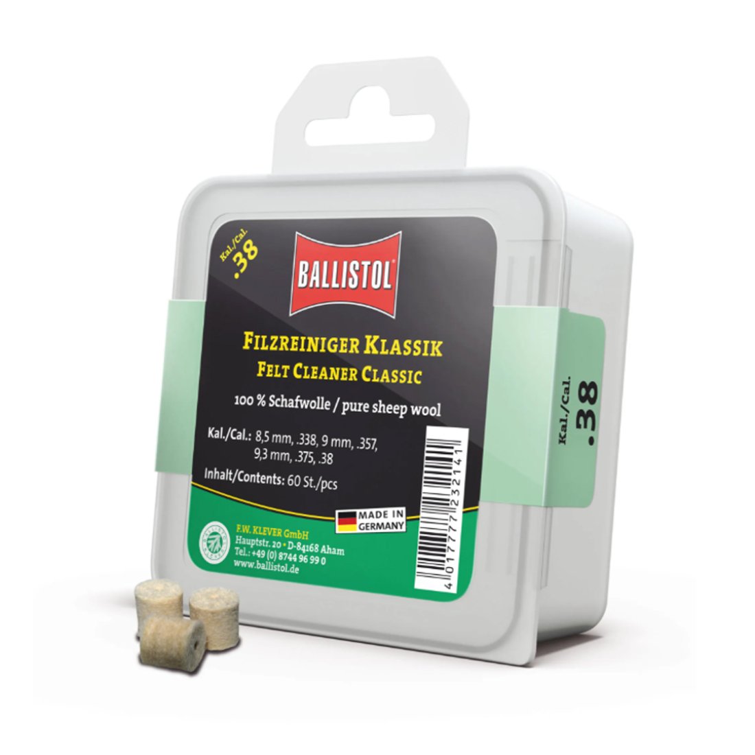 Fabricados 100 % con lana de oveja sin rellenos ni auxiliares, son adecuados para armas de calibre .22, .222, .223, .224, 5,5 mm, 5,56 mm, 5,6 mm y .228.